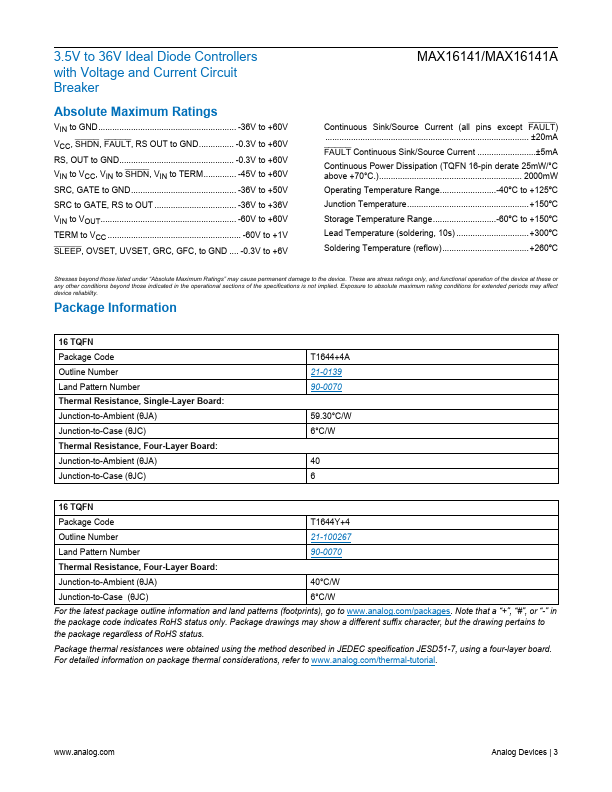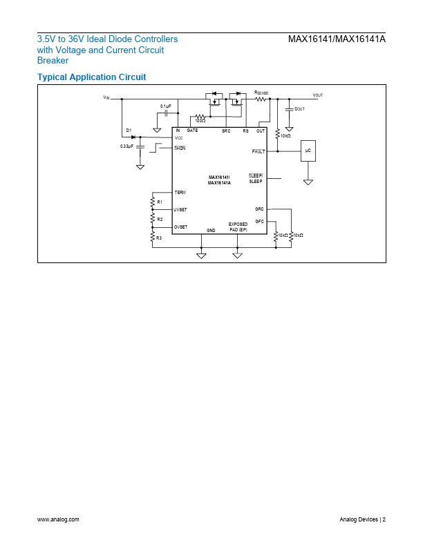 The MAX16141/MAX16141A ideal diode controllers provide system protection against a variety of system faults, such as reverse current, reverse voltage, overcurrent, input overvoltage/undervoltage, and overtemperature conditions. The wide operating voltage range of 3.5V to 36V, bined with 5μA (typ) of shutdown current, make the MAX16141/MAX16141A ideal for automotive applications. An integrated charge pump drives the...