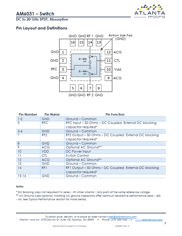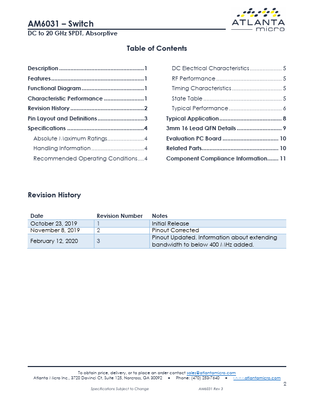 AM6031 is a Single-Pole Double-Throw (SPDT) absorptive switch covering the DC to 20 GHz frequency range.