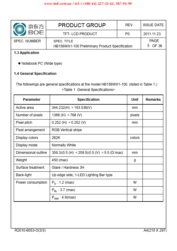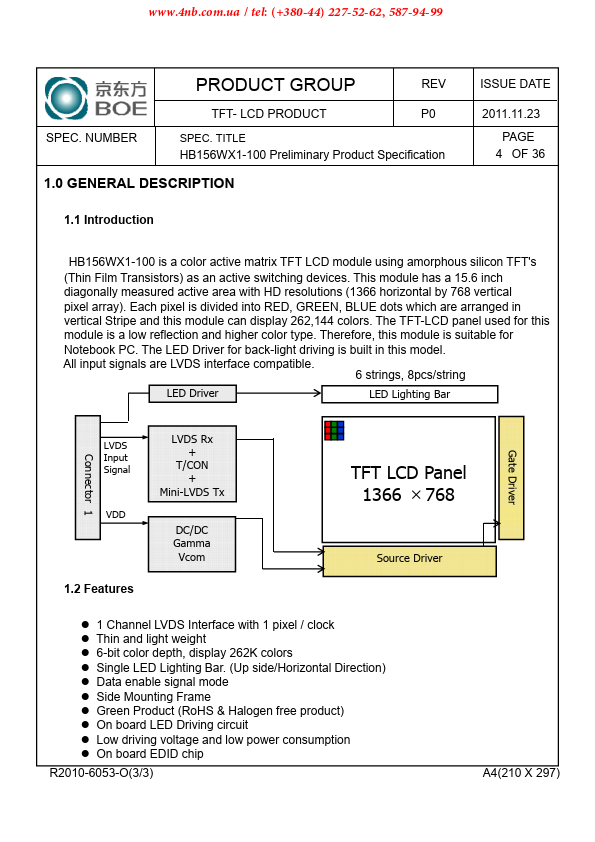 1.1 Introduction ISSUE DATE 2011.11.23 PAGE 4 OF 36 HB156WX1-100 is a color active matrix TFT LCD module using amorphous silicon TFT's (Thin Film Transistors) as an active switching devices. This module has a 15.6 inch diagonally measured active area with HD resolutions (1366 horizontal by 768 vertical pixel array). Each pixel is divided into RED, GREEN, BLUE dots which are arranged in vertical Stripe and this...