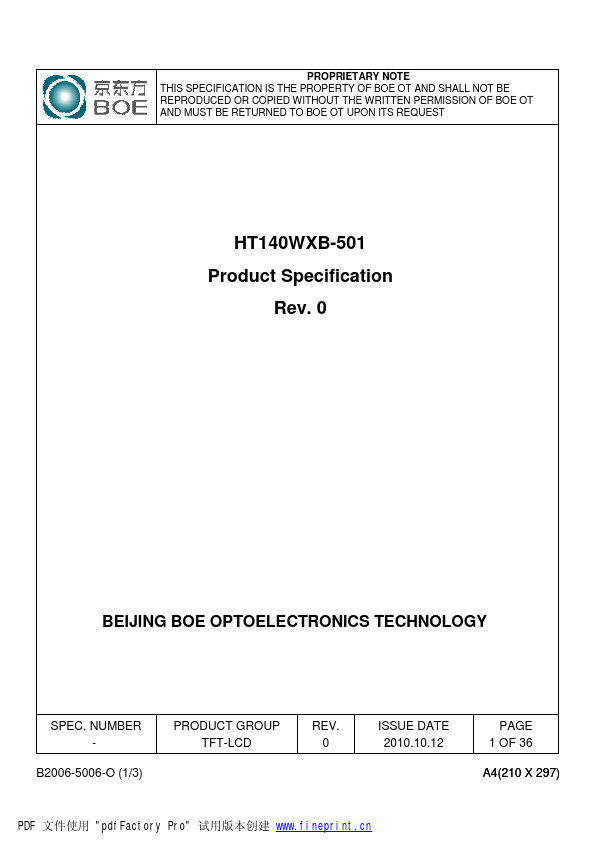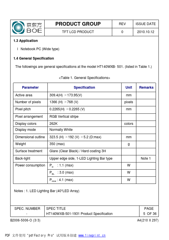 0 2010.10.12 1.1 Introduction HT140WXB-501 is a color active matrix TFT LCD module using amorphous silicon TFT's (Thin Film Transistors) as an active switching devices. This module has a 14.0 inch diagonally measured active area with WXGA resolutions (1366 horizontal by 768 vertical pixel array). Each pixel is divided into RED, GREEN, BLUE dots which are arranged in vertical Stripe and this module can display...