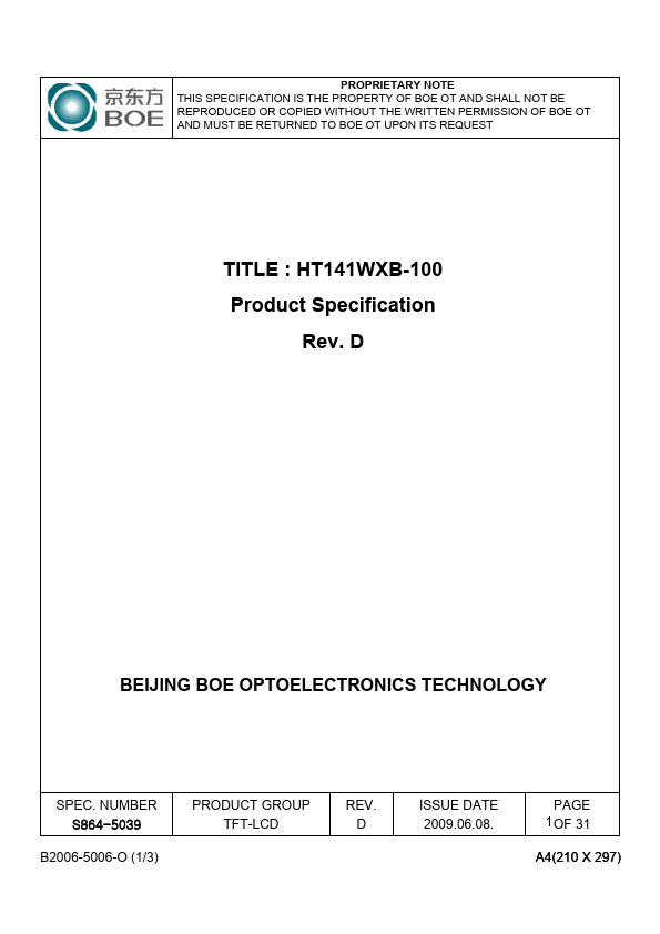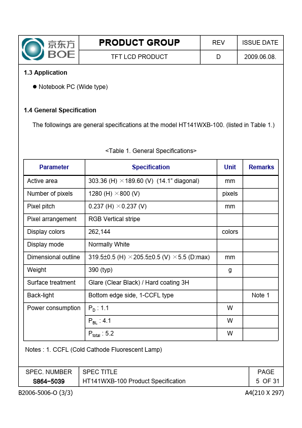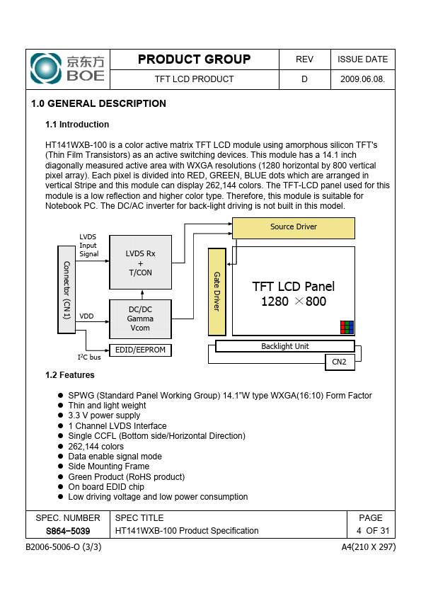 1.1 Introduction HT141WXB-100 is a color active matrix TFT LCD module using amorphous silicon TFT's (Thin Film Transistors) as an active switching devices. This module has a 14.1 inch diagonally measured active area with WXGA resolutions (1280 horizontal by 800 vertical pixel array). Each pixel is divided into RED, GREEN, BLUE dots which are arranged in vertical Stripe and this module can display 262,144 colors.