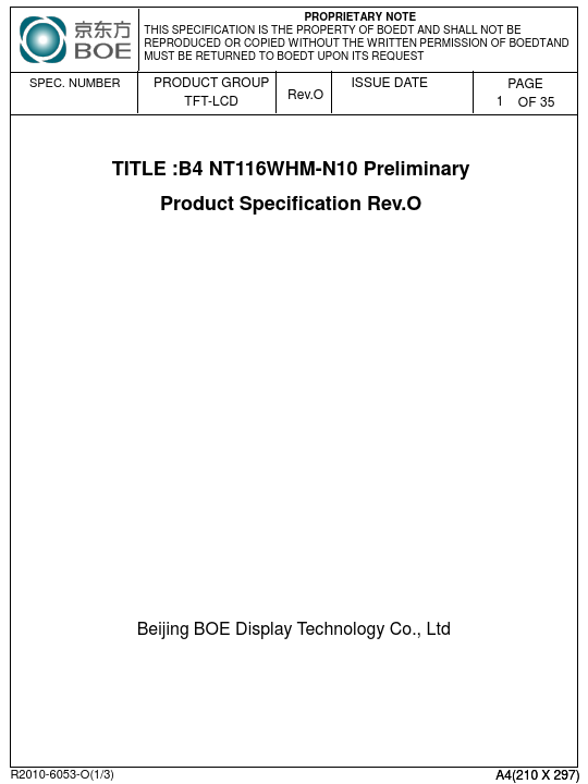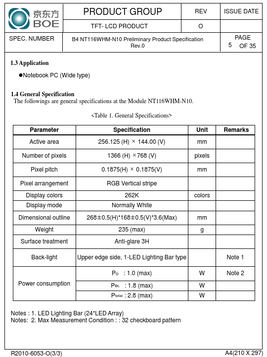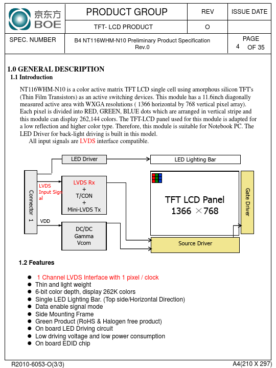 1.1 Introduction NT116WHM-N10 is a color active matrix TFT LCD single cell using amorphous silicon TFT's (Thin Film Transistors) as an active switching devices. This module has a 11.6inch diagonally measured active area with WXGA resolutions ( 1366 horizontal by 768 vertical pixel array). Each pixel is divided into RED, GREEN, BLUE dots which are arranged in vertical stripe and this module can display 262,144 colors.