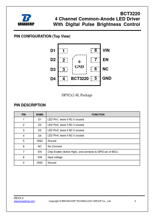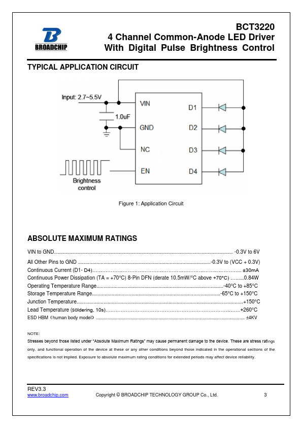 The BCT3220 uses an internal resistor to set the bias current for four LEDs, which are matched to 1.5%.
