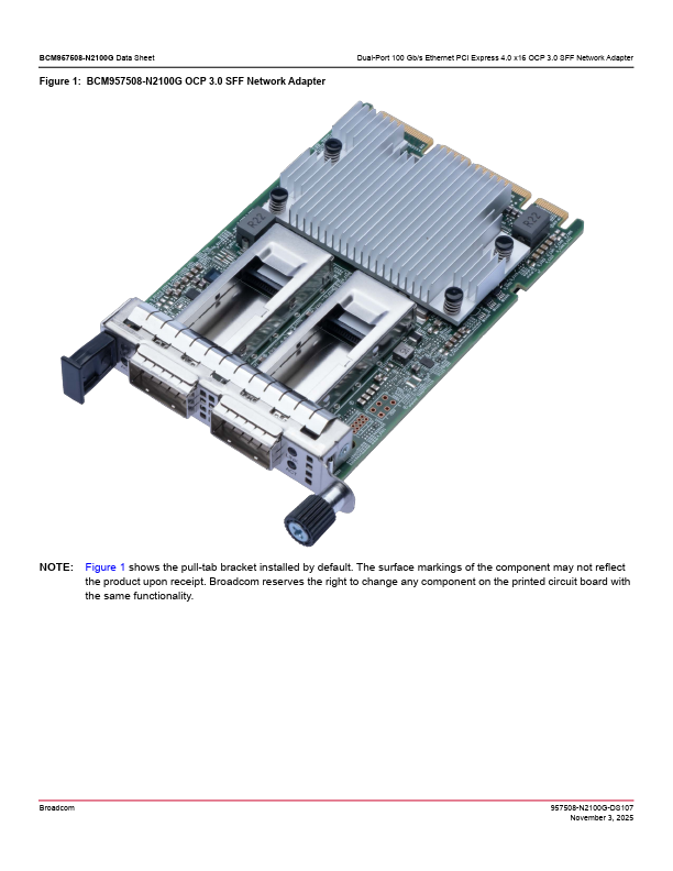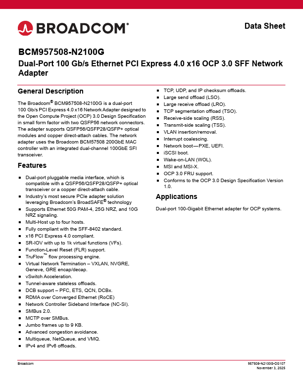 The Broad® BCM957508-N2100G is a dual-port 100 Gb/s PCI Express 4.0 x16 Network Adapter designed to the Open pute Project (OCP) 3.0 Design Specification in small form factor with two QSFP56 network connectors. The adapter supports QSFP56/QSFP28/QSFP+ optical modules and copper direct-attach cables. The network adapter uses the Broad BCM57508 200GbE MAC controller with an integrated dual-channel 100GbE SFI...