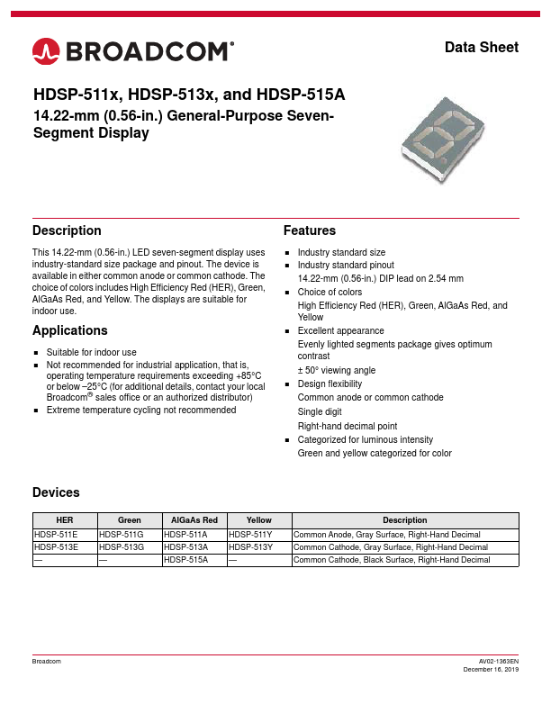 Overview: HDSP-511x, HDSP-513x, and HDSP-515A 14.22-mm (0.56-in.) General-Purpose SevenSegment Display Data.