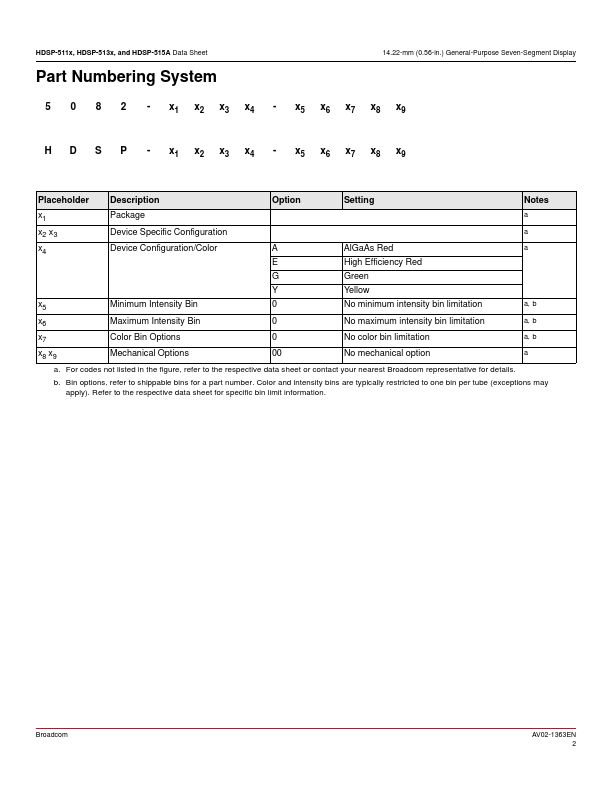 Overview: HDSP-511x, HDSP-513x, and HDSP-515A 14.22-mm (0.56-in.) General-Purpose SevenSegment Display Data.