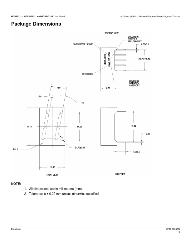 Overview: HDSP-511x, HDSP-513x, and HDSP-515A 14.22-mm (0.56-in.) General-Purpose SevenSegment Display Data.