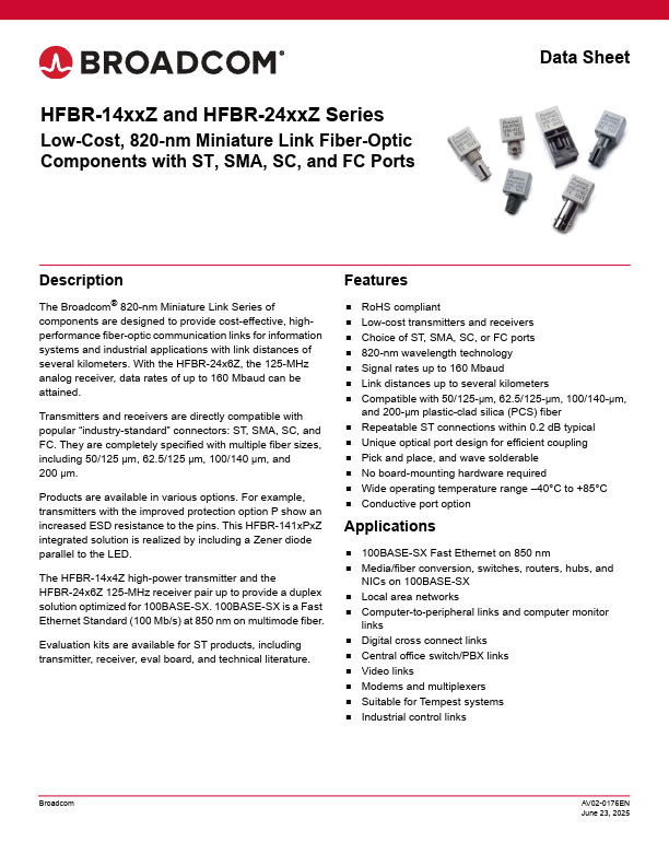 The Broad® 820-nm Miniature Link Series of ponents are designed to provide cost-effective, highperformance fiber-optic munication links for information systems and industrial applications with link distances of several kilometers. With the HFBR-24x6Z, the 125-MHz analog receiver, data rates of up to 160 Mbaud can be attained. Transmitters and receivers are directly patible with popular “industry-standard”...