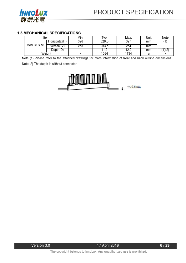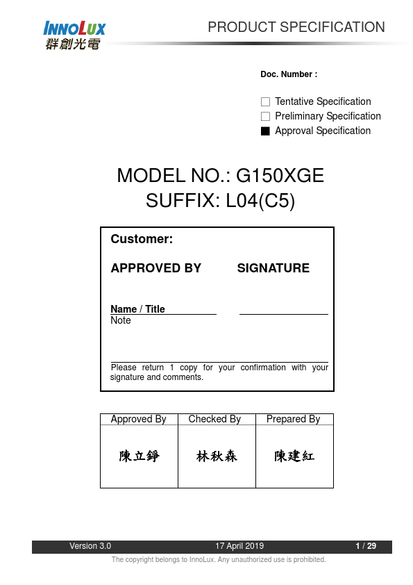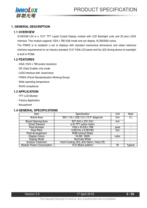 1.1 OVERVIEW G150XGE-L04 is a 15.0” TFT Liquid Crystal Display module with LED Backlight units and 20 pins LVDS interface. This module supports 1024 x 768 XGA mode and can display 16.2M/262k colors. The PSWG is to establish a set of displays with standard mechanical dimensions and select electrical interface requirements for an industry standard 15.0” XGA LCD panel and the LED driving device for backlight is built...