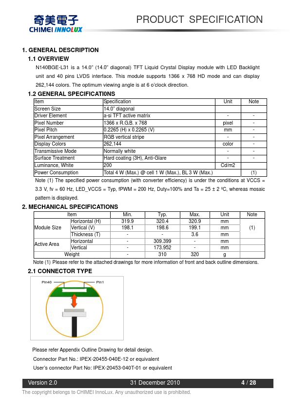 1.1 OVERVIEW N140BGE-L31 is a 14.0” (14.0” diagonal) TFT Liquid Crystal Display module with LED Backlight unit and 40 pins LVDS interface. This module supports 1366 x 768 HD mode and can display 262,144 colors. The optimum viewing angle is at 6 o’clock direction.