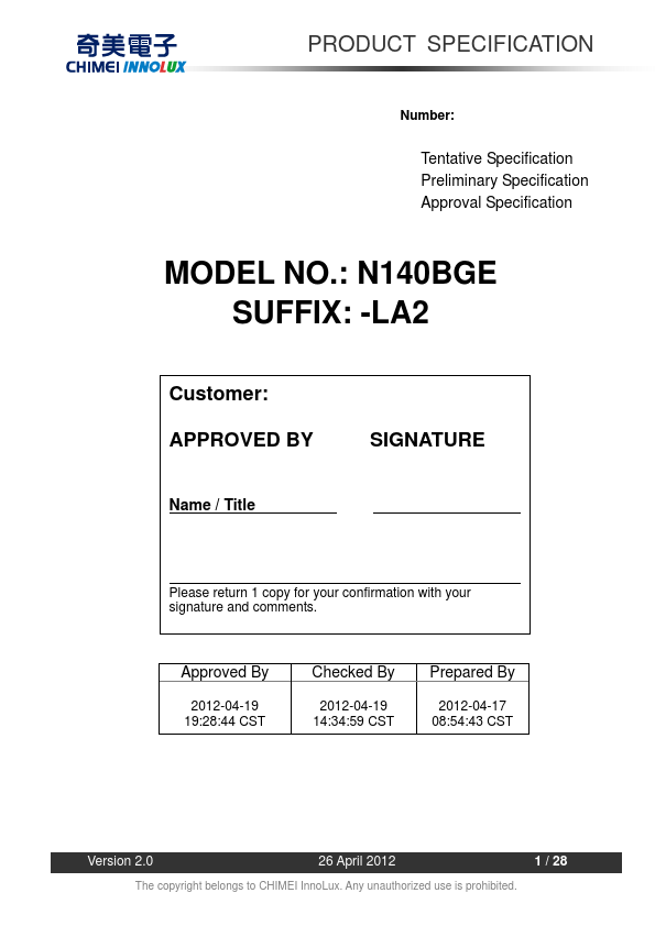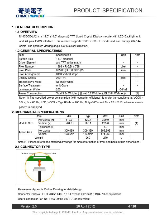 1.1 OVERVIEW N140BGE-LA2 is a 14.0” (14.0” diagonal) TFT Liquid Crystal Display module with LED Backlight unit and 40 pins LVDS interface. This module supports 1366 x 768 HD mode and can display 262,144 colors. The optimum viewing angle is at 6 o’clock direction.