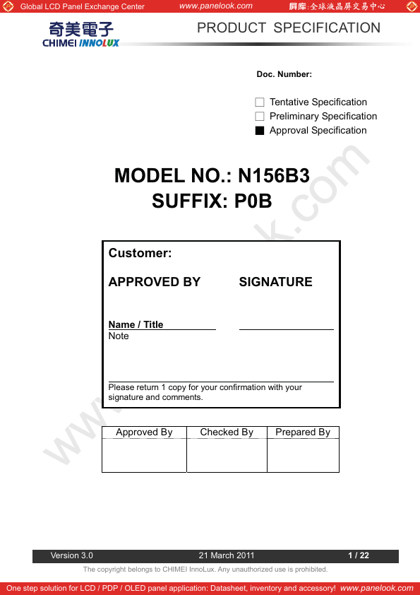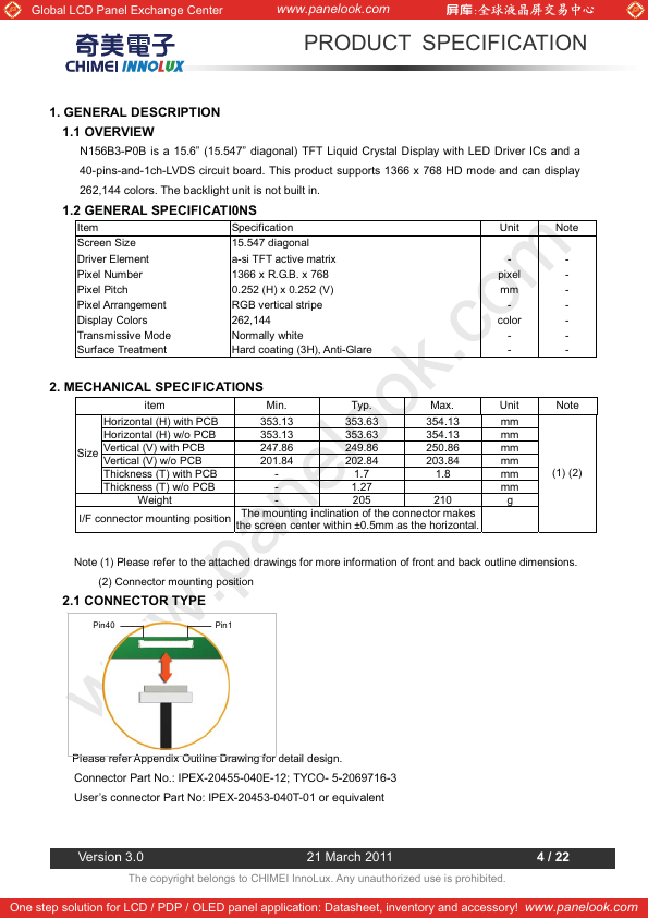 1.1 OVERVIEW N156B3-P0B is a 15.6” (15.547” diagonal) TFT Liquid Crystal Display with LED Driver ICs and a 40-pins-and-1ch-LVDS circuit board. This product supports 1366 x 768 HD mode and can display 262,144 colors. The backlight unit is not built in.
