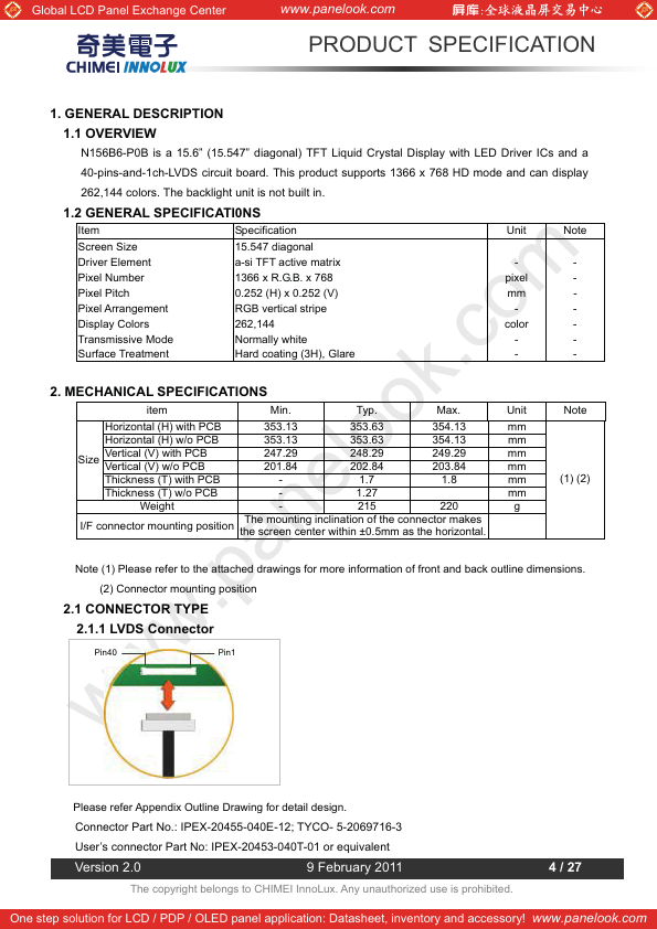 1.1 OVERVIEW N156B6-P0B is a 15.6” (15.547” diagonal) TFT Liquid Crystal Display with LED Driver ICs and a 40-pins-and-1ch-LVDS circuit board. This product supports 1366 x 768 HD mode and can display 262,144 colors. The backlight unit is not built in.