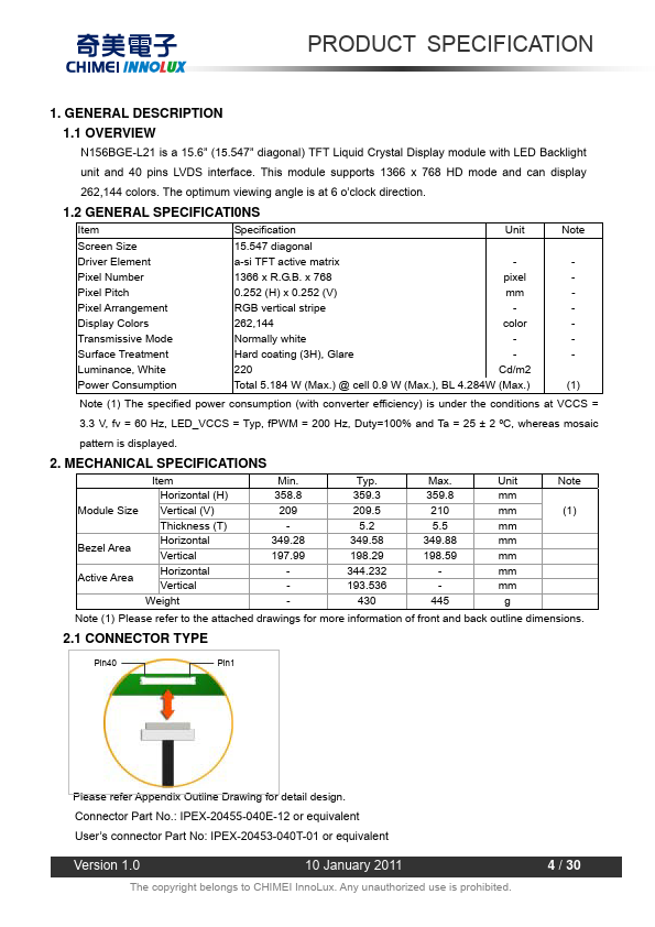 1.1 OVERVIEW N156BGE-L21 is a 15.6” (15.547” diagonal) TFT Liquid Crystal Display module with LED Backlight unit and 40 pins LVDS interface. This module supports 1366 x 768 HD mode and can display 262,144 colors. The optimum viewing angle is at 6 o’clock direction.