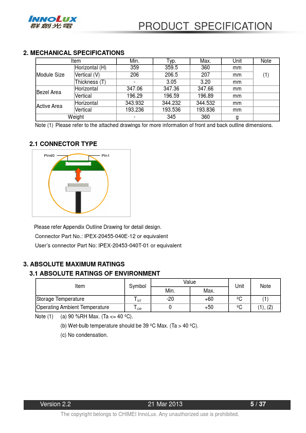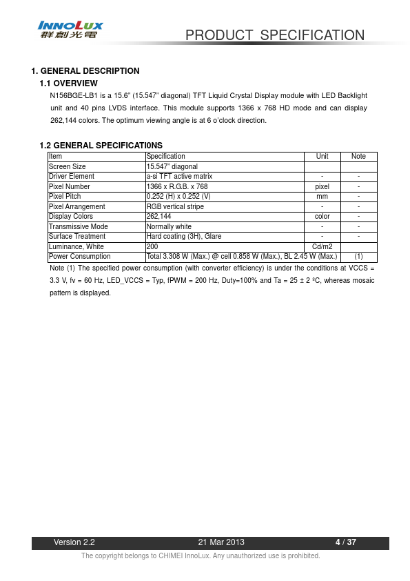1.1 OVERVIEW N156BGE-LB1 is a 15.6” (15.547” diagonal) TFT Liquid Crystal Display module with LED Backlight unit and 40 pins LVDS interface. This module supports 1366 x 768 HD mode and can display 262,144 colors. The optimum viewing angle is at 6 o’clock direction.