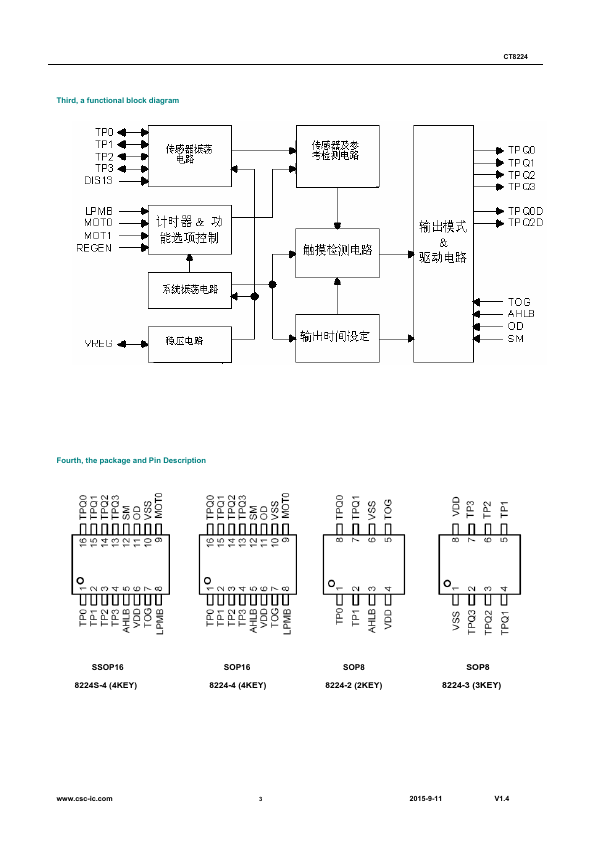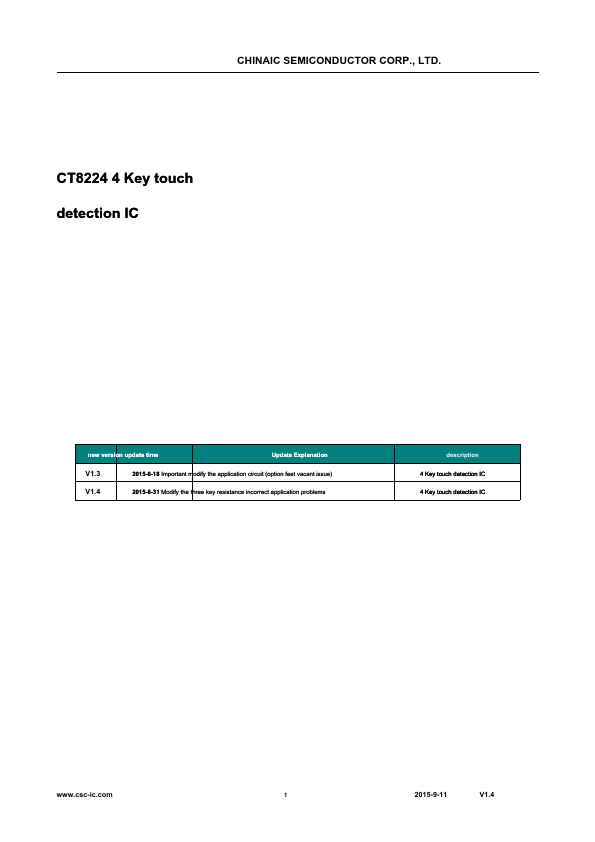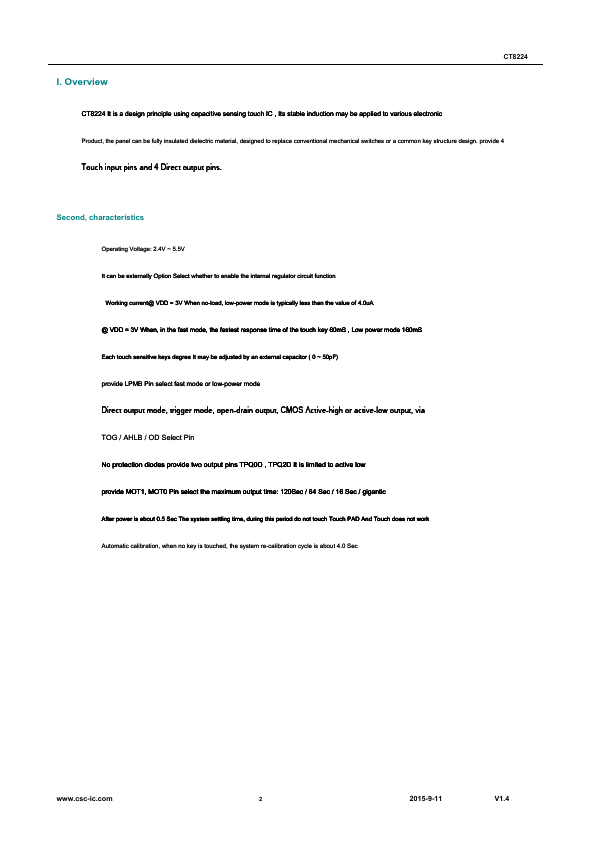 4 Key touch detection IC 4 Key touch detection IC .csc-ic. Overview CT8224 CT8224 It is a design principle using capacitive sensing touch IC , Its stable induction may be applied to various electronic Product, the panel can be fully insulated dielectric material, designed to replace conventional mechanical switches or a mon key structure design. provide 4 Touch input pins and 4 Direct output pins.