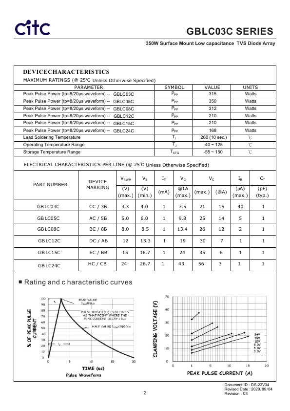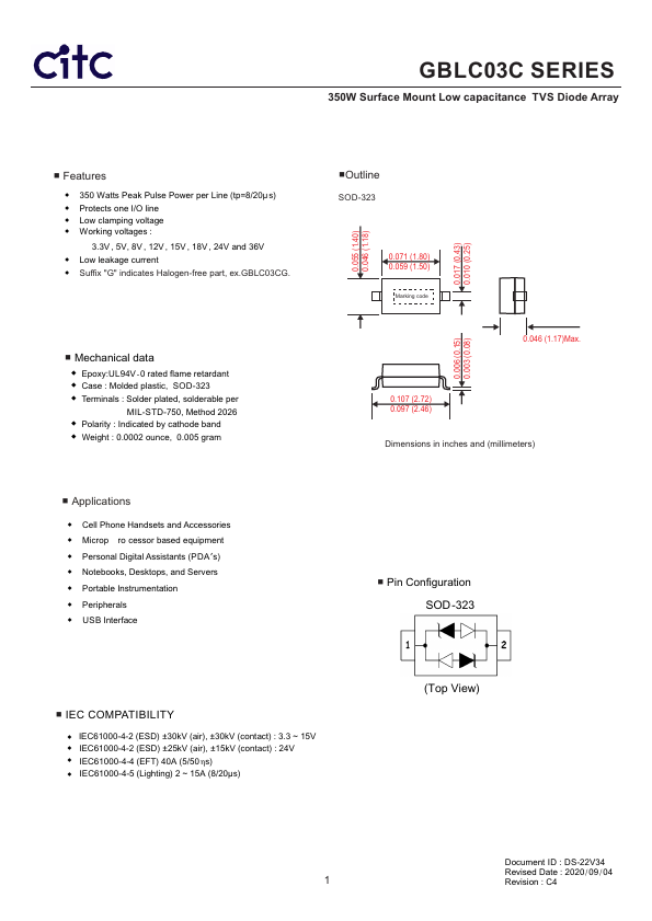 GBLC03C SERIES 350W Surface Mount Low capacitance TVS Diode Array.