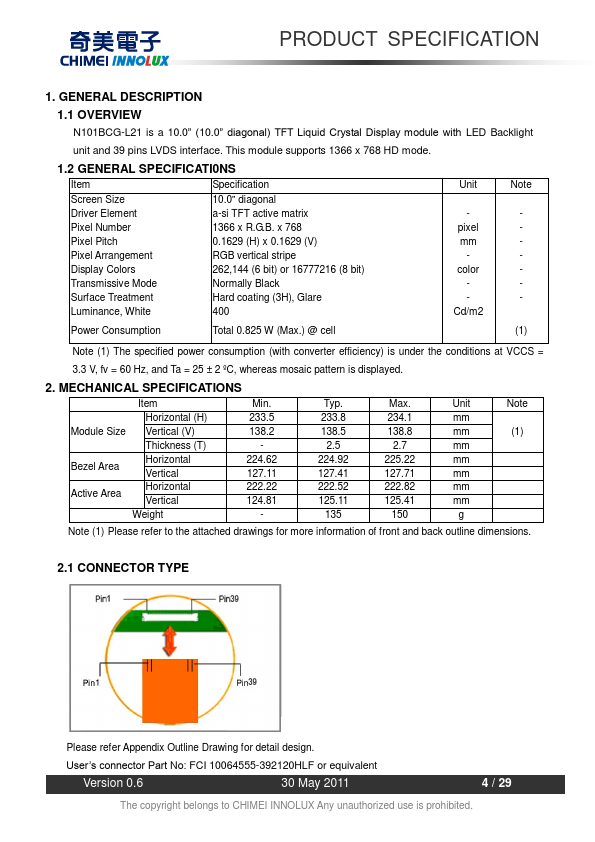 1.1 OVERVIEW N101BCG-L21 is a 10.0” (10.0” diagonal) TFT Liquid Crystal Display module with LED Backlight unit and 39 pins LVDS interface. This module supports 1366 x 768 HD mode. 1.2 GENERAL SPECIFICATI0NS Item Specification Screen Size 10.0” diagonal Driver Element a-si TFT active matrix Pixel Number 1366 x R.G.B.
