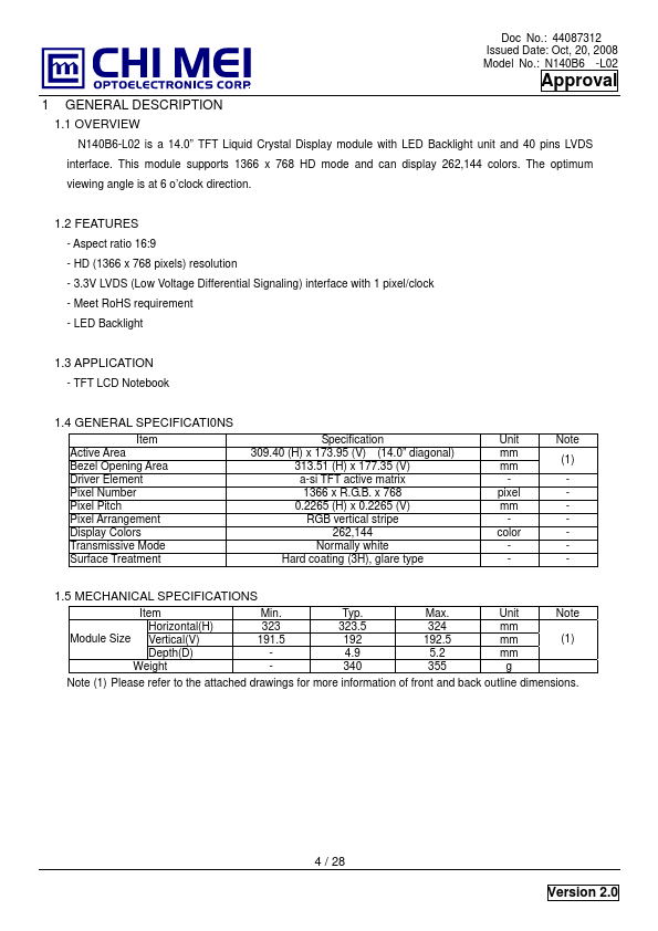 1.1 OVERVIEW N140B6-L02 is a 14.0” TFT Liquid Crystal Display module with LED Backlight unit and 40 pins LVDS interface. This module supports 1366 x 768 HD mode and can display 262,144 colors. The optimum viewing angle is at 6 o’clock direction.