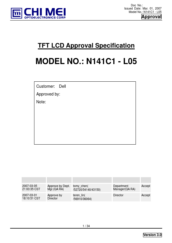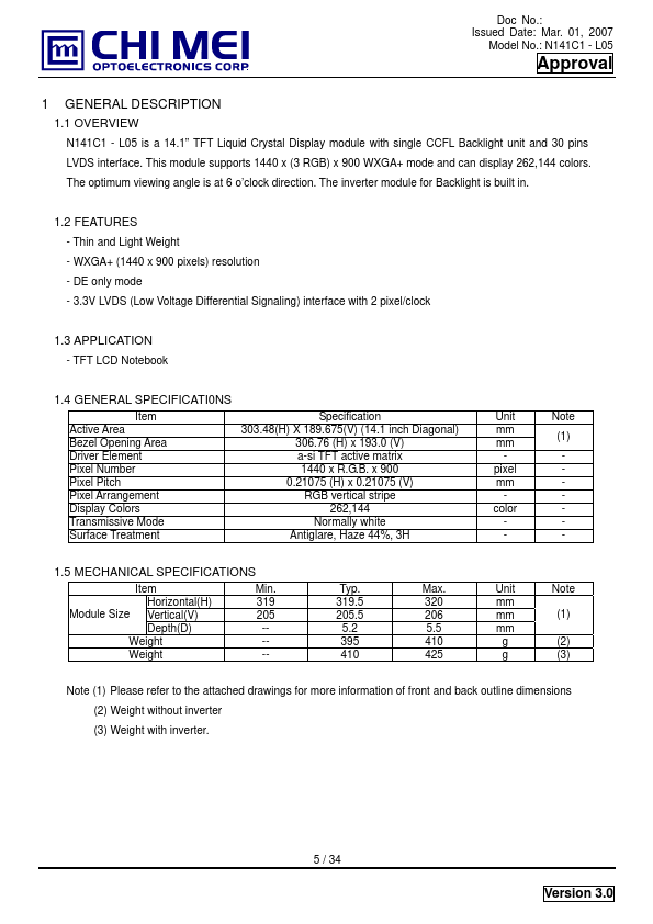 1.1 OVERVIEW N141C1 - L05 is a 14.1” TFT Liquid Crystal Display module with single CCFL Backlight unit and 30 pins LVDS interface. This module supports 1440 x (3 RGB) x 900 WXGA+ mode and can display 262,144 colors. The optimum viewing angle is at 6 o’clock direction.