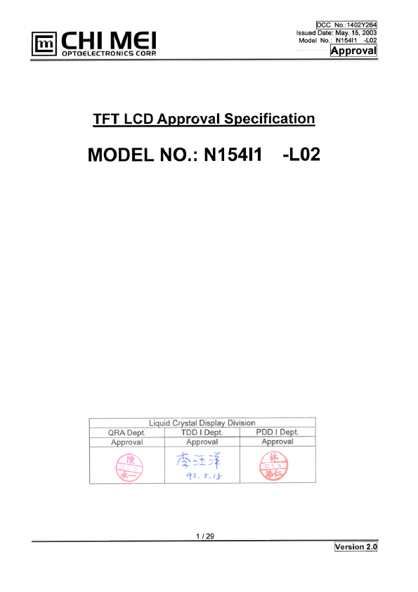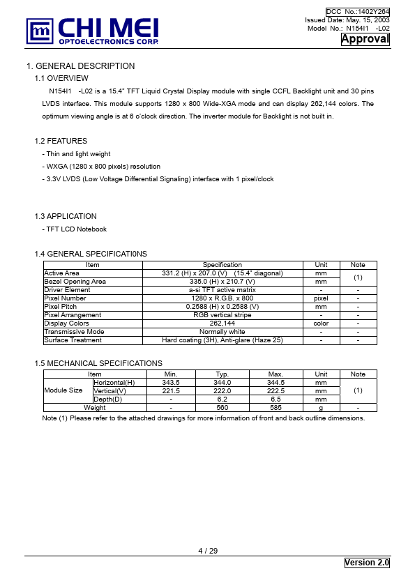 1.1 OVERVIEW N154I1 -L02 is a 15.4” TFT Liquid Crystal Display module with single CCFL Backlight unit and 30 pins LVDS interface. This module supports 1280 x 800 Wide-XGA mode and can display 262,144 colors. The optimum viewing angle is at 6 o’clock direction.