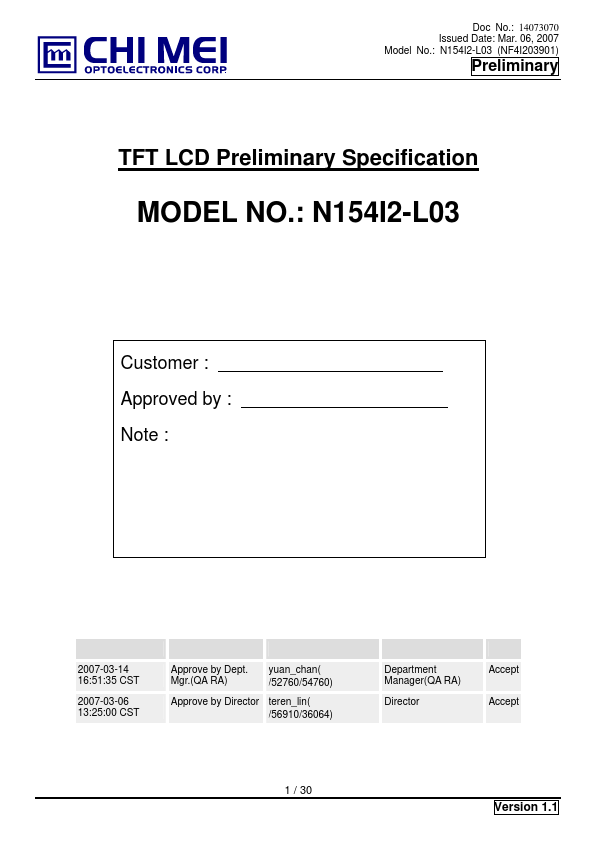 1.1 OVERVIEW N154I2 -L03 is a 15.4” TFT Liquid Crystal Display module with single CCFL Backlight unit and 30 pins LVDS interface. This module supports 1280 x 800 Wide-XGA mode and can display 262,144 colors. The optimum viewing angle is at 6 o’clock direction.