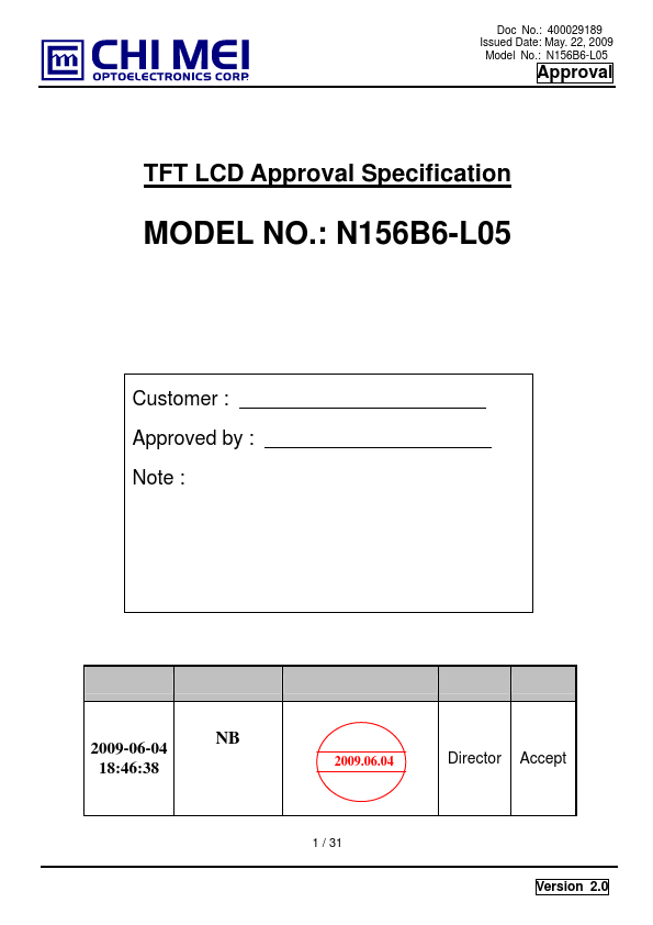 1.1 OVERVIEW N156B6-L05 is a 15.6” (15.547” diagonal) TFT Liquid Crystal Display module with LED Backlight unit and 40 pins LVDS interface. This module supports 1366 x 768 HD mode and can display 262,144 colors. The optimum viewing angle is at 6 o’clock direction.