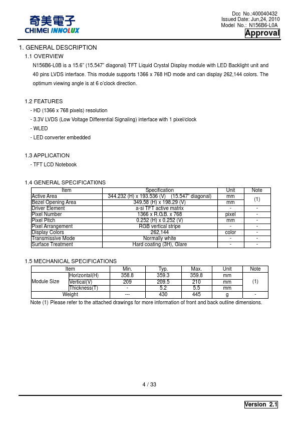 1.1 OVERVIEW N156B6-L0B is a 15.6” (15.547” diagonal) TFT Liquid Crystal Display module with LED Backlight unit and 40 pins LVDS interface. This module supports 1366 x 768 HD mode and can display 262,144 colors. The optimum viewing angle is at 6 o’clock direction.