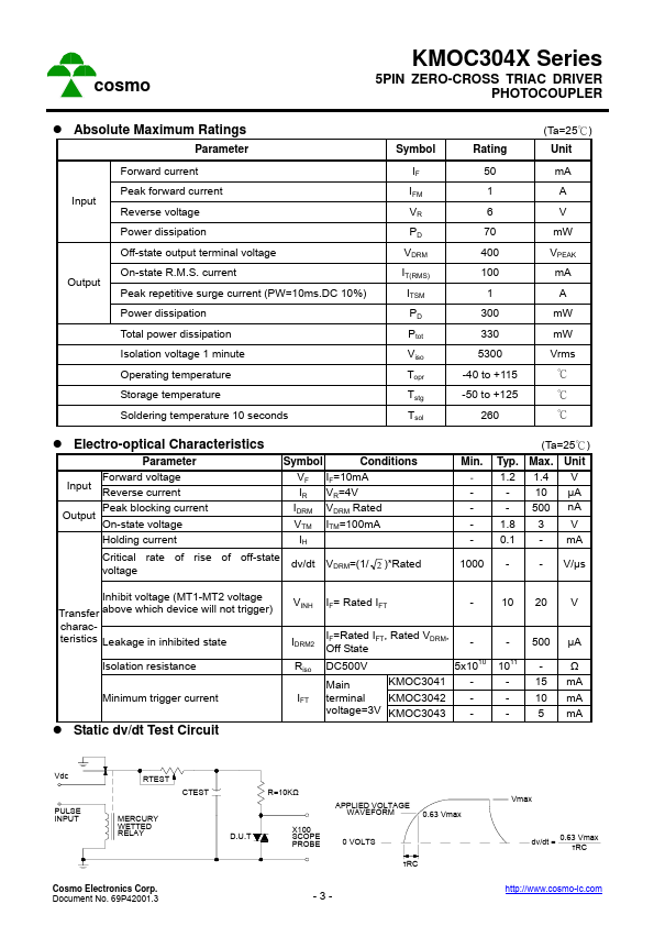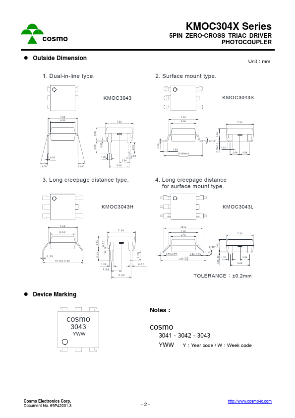 The KMOC3041 、 KMOC3042 、 KMOC3043 series consist of a GaAs infrared emitting diode optically coupled to a monolithic silicon detector performing the function of a zero voltage crossing bilateral TRIAC driver.