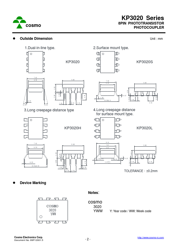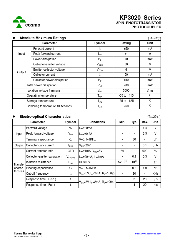 The KP3020 series consist of two infrared emitting diodes, connected in inverse parallel, optically coupled to a phototransistor detector.