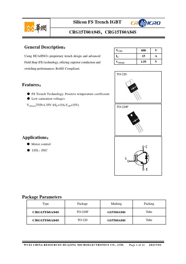 : Using HUAJING's proprietary trench design and advanced Field Stop (FS) technology, offering superior conduction and switching performances.