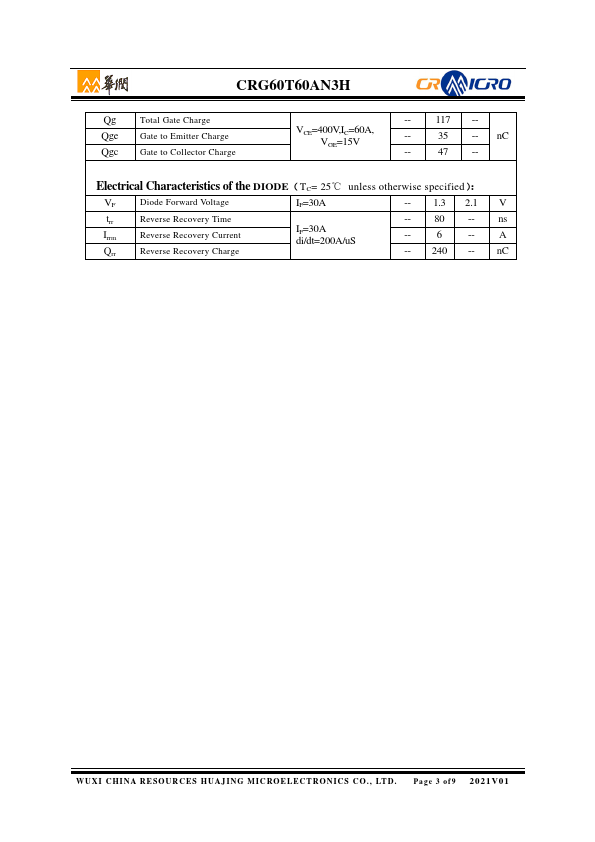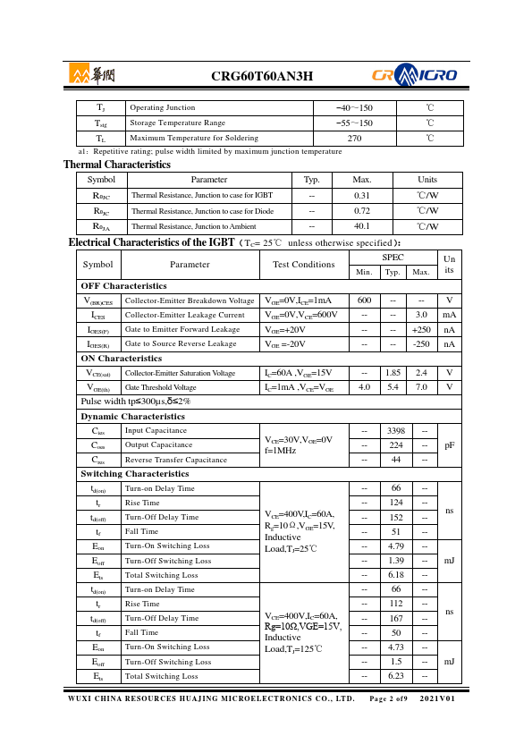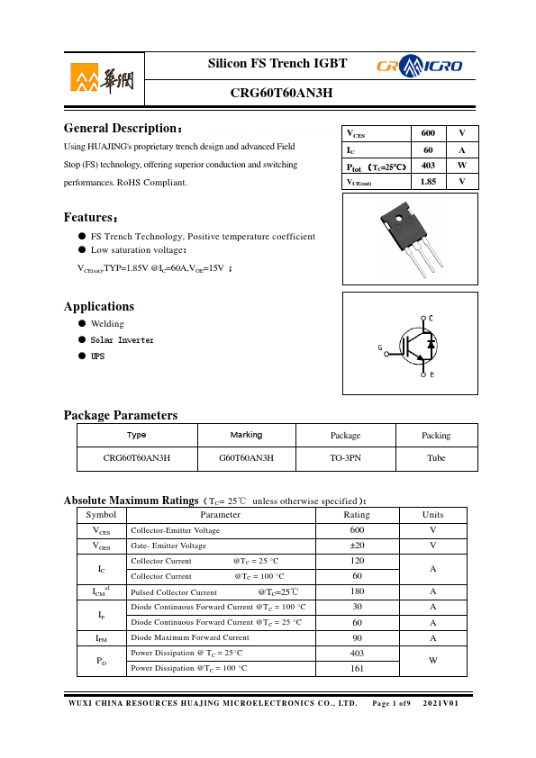: Using HUAJING's proprietary trench design and advanced Field Stop (FS) technology, offering superior conduction and switching performances. VCES 600 V IC 60 A Ptot (TC=25℃) 403 W VCE(sat) 1.85.