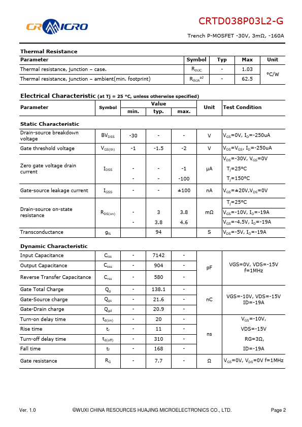 Features Uses CRM advanced Trench technology Extremely low on-resistance RDS(on) Excellent QgxRDS(on) product(FOM) Qualified according to JEDEC criteria Applications Motor control and drive Electrical tools Lithium battery protection CRTD038P03L2-G Trench P-MOSFET -30V, 3mΩ, -160A Product Summary VDS -30V RDS(on) typ. 1.0 ©WUXI CHINA RESOURCES HUAJING MICROELECTRONICS CO., LTD. Page 1 CRTD038P03L2-G Trench P-MOSFET...
