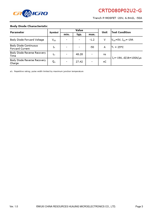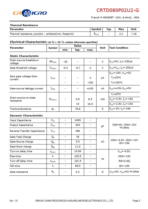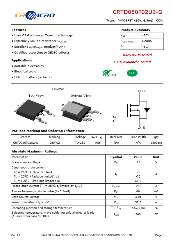 Features Uses CRM advanced Trench technology Extremely low on-resistance RDS(on) Excellent QgxRDS(on) product(FOM) Qualified according to JEDEC criteria Applications portable electronics Electrical tools Lithium battery protection CRTD080P02U2-G Trench P-MOSFET -20V, 6.9mΩ, -50A Product Summary VDS -20V RDS(on) typ. 1.0 ©WUXI CHINA RESOURCES HUAJING MICROELECTRONICS CO., LTD. Page 1 CRTD080P02U2-G Trench P-MOSFET...