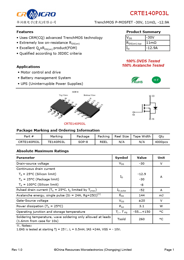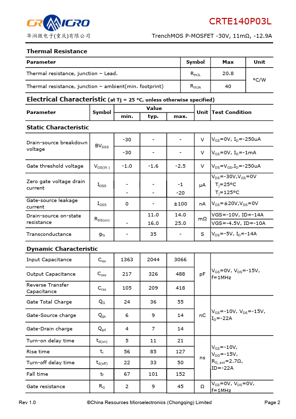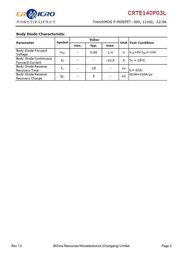 华润微电子(重庆)有限公司 CRTE140P03L TrenchMOS P-MOSFET -30V, 11mΩ, -12.9A.