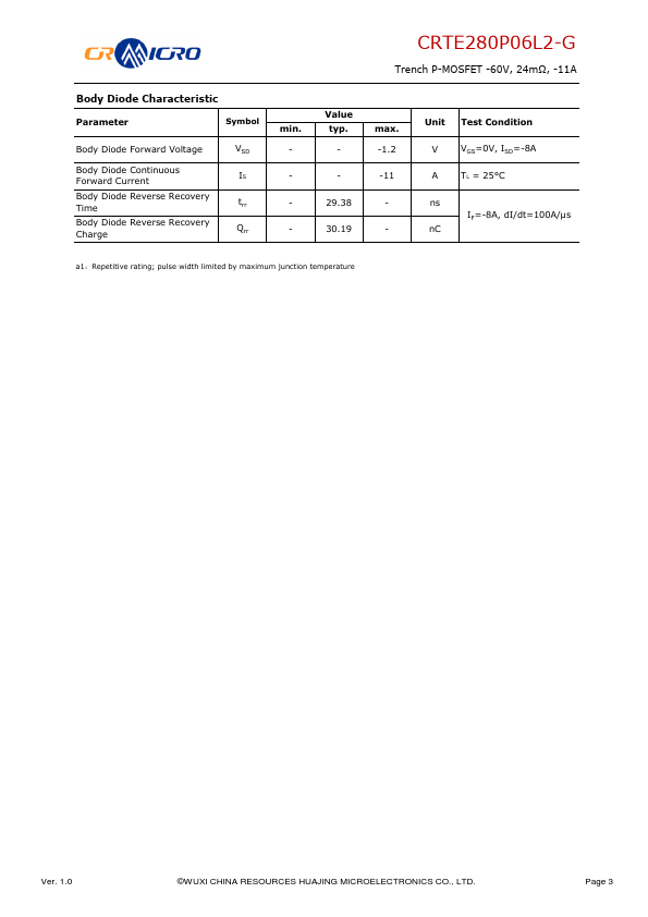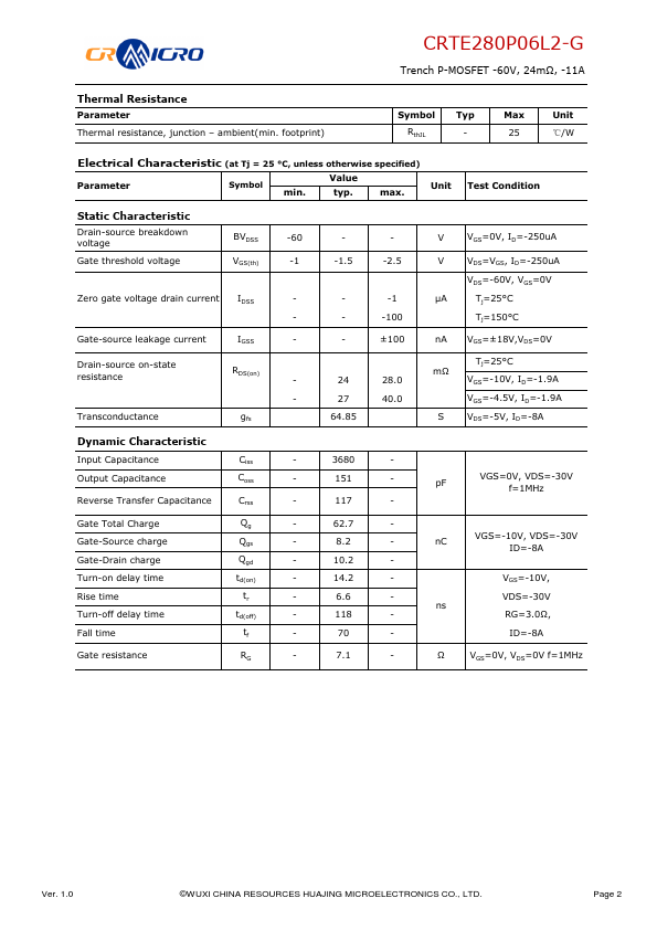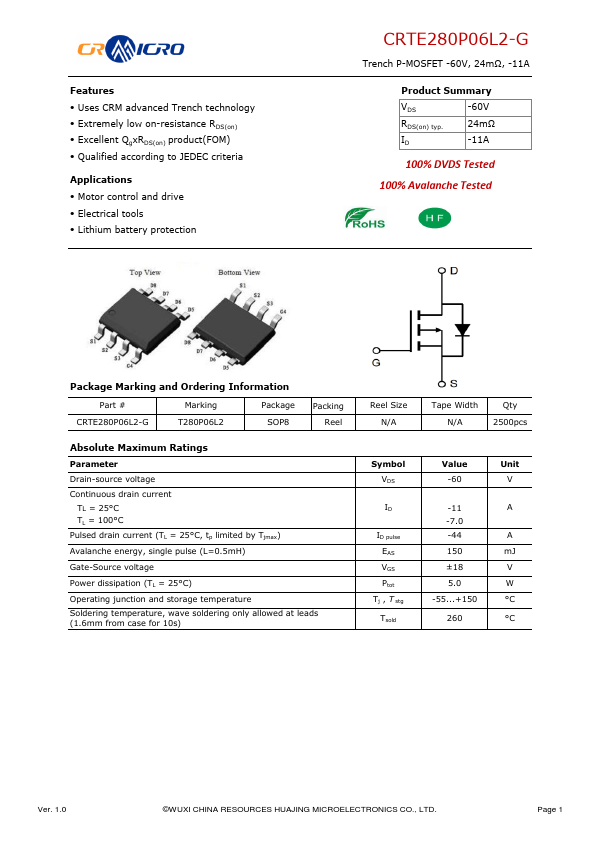 Features Uses CRM advanced Trench technology Extremely low on-resistance RDS(on) Excellent QgxRDS(on) product(FOM) Qualified according to JEDEC criteria Applications Motor control and drive Electrical tools Lithium battery protection CRTE280P06L2-G Trench P-MOSFET -60V, 24mΩ, -11A Product Summary VDS -60V RDS(on) typ. 1.0 ©WUXI CHINA RESOURCES HUAJING MICROELECTRONICS CO., LTD. Page 1 CRTE280P06L2-G Trench P-MOSFET...