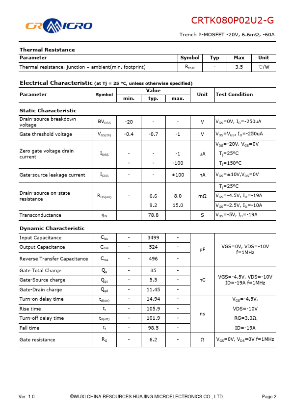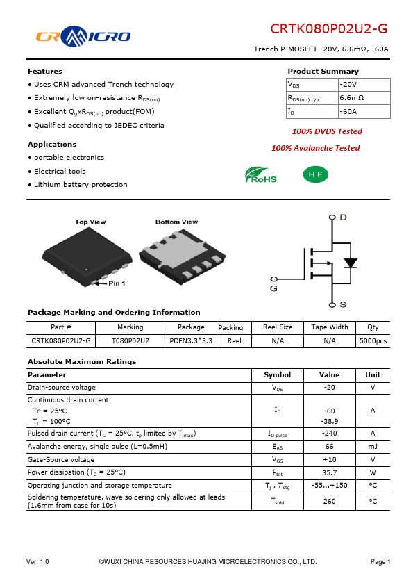 Features Uses CRM advanced Trench technology Extremely low on-resistance RDS(on) Excellent QgxRDS(on) product(FOM) Qualified according to JEDEC criteria Applications portable electronics Electrical tools Lithium battery protection CRTK080P02U2-G Trench P-MOSFET -20V, 6.6mΩ, -60A Product Summary VDS -20V RDS(on) typ. 1.0 ©WUXI CHINA RESOURCES HUAJING MICROELECTRONICS CO., LTD. Page 1 CRTK080P02U2-G Trench P-MOSFET...