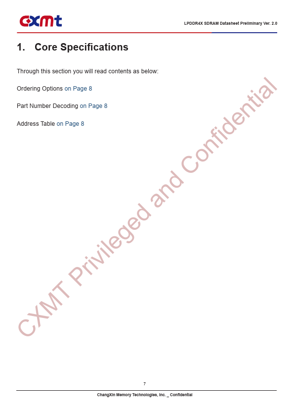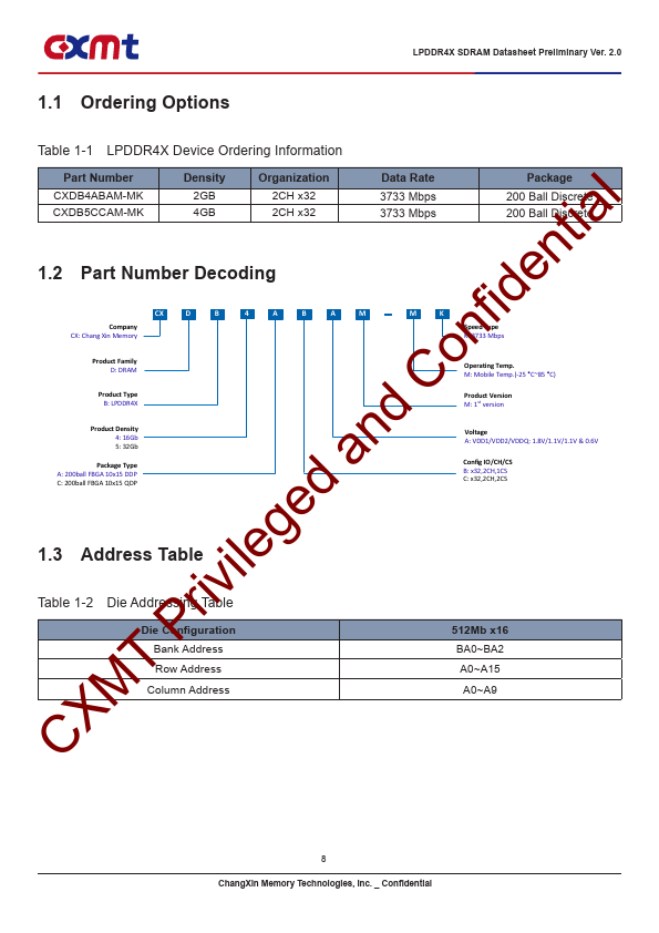 nfidential LPDDR4X SDRAM Datasheet nd Co ChangXin Memory Technologies, Inc. ed a Preliminary Version 2.0 Privileg April 9, 2020 CXMT ChangXin Memory Technologies, Inc. _ Confidential LPDDR4X SDRAM Datasheet Preliminary Ver.
