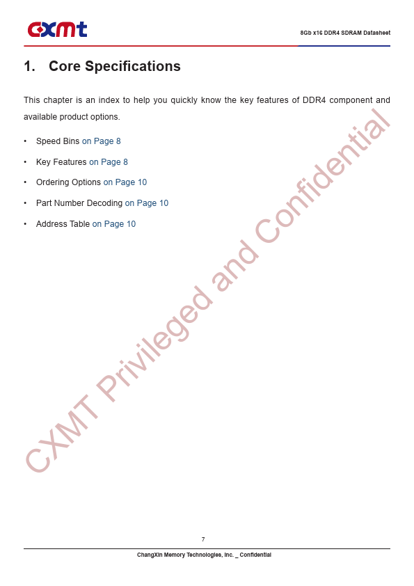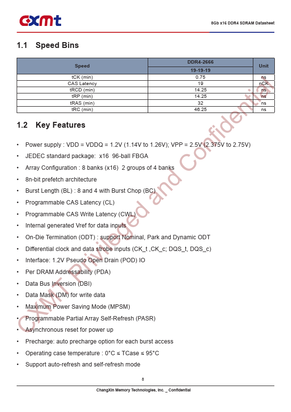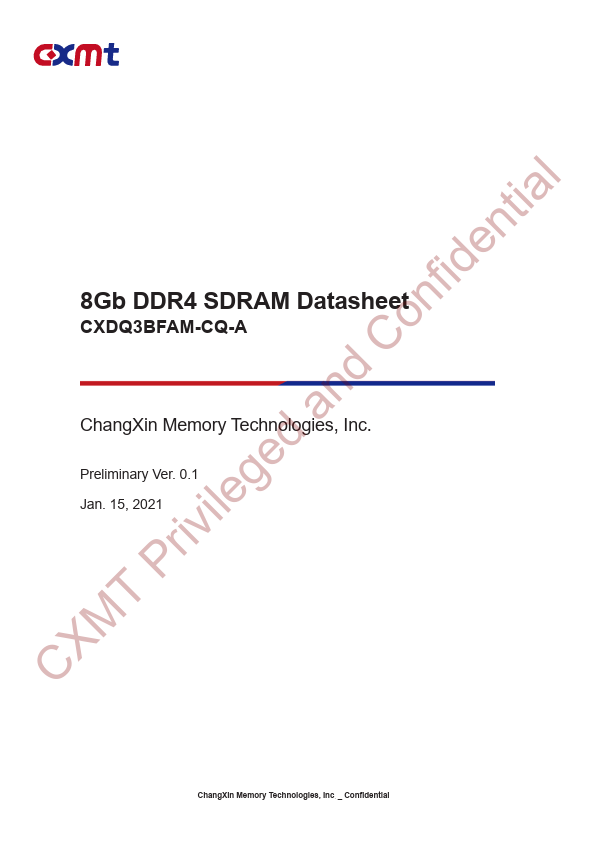 nfidential 8Gb DDR4 SDRAM Datasheet o CXDQ3BFAM-CQ-A and C ChangXin Memory Technologies, Inc. 15, 2021 CXMT ChangXin Memory Technologies, Inc. _ Confidential 8Gb x16 DDR4 SDRAM Datasheet.