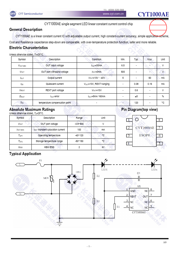 CYT1000AE is a linear constant current IC with adjustable output current, high constant-current accuracy, simple application scheme, Cost and Resistance capacitance step-down are parable, with over-temperature protection function, safer and more reliable. Electric Characteristics Unless otherwise stated, TA=25° C. Symbol Description Condition Min.
