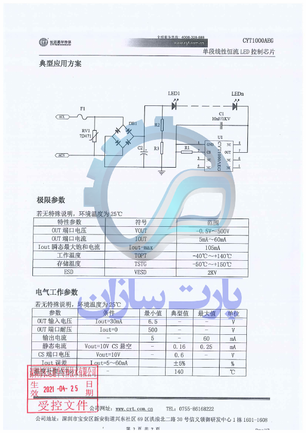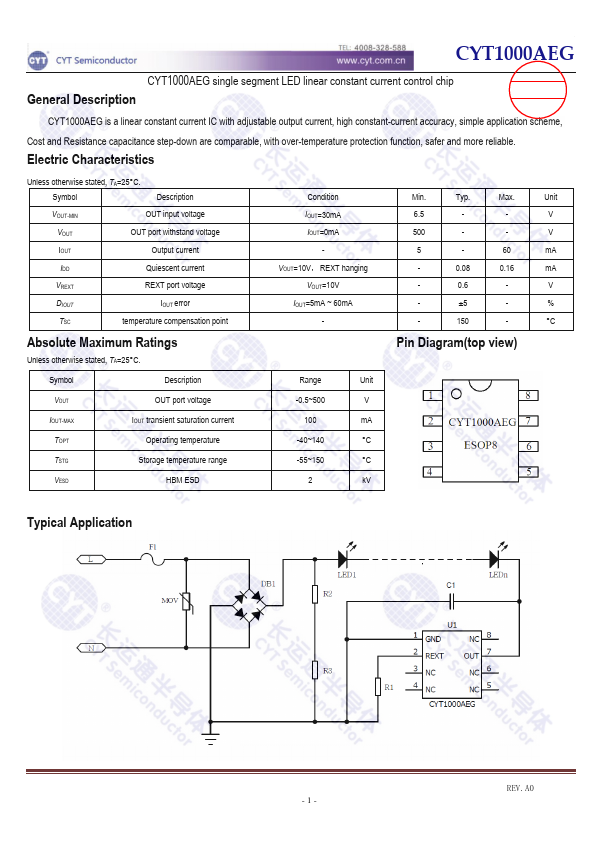 CYT1000AEG is a linear constant current IC with adjustable output current, high constant-current accuracy, simple application scheme, Cost and Resistance capacitance step-down are parable, with over-temperature protection function, safer and more reliable. Electric Characteristics Unless otherwise stated, TA=25° C. Symbol Description VOUT-MIN OUT input voltage VOUT OUT port withstand voltage IOUT Output current IDD...