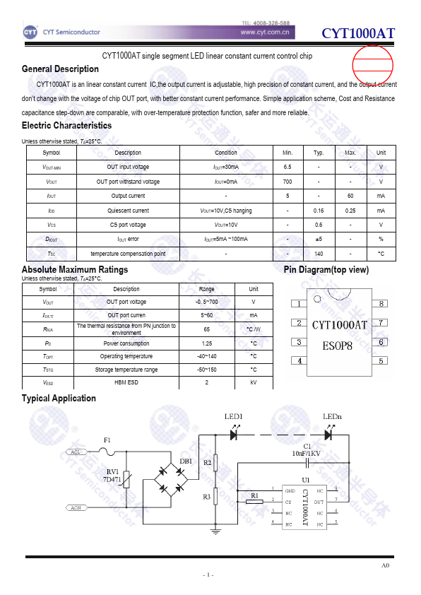 CYT1000AT is an linear constant current IC,the output current is adjustable, high precision of constant current, and the output current don’t change with the voltage of chip OUT port, with better constant current performance. Simple application scheme, Cost and Resistance capacitance step-down are parable, with over-temperature protection function, safer and more reliable. Electric Characteristics Unless otherwise...