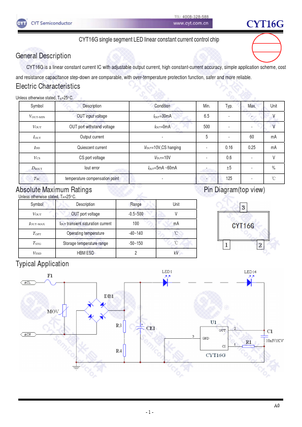 CYT16G is a linear constant current IC with adjustable output current, high constant-current accuracy, simple application scheme, cost and resistance capacitance step-down are parable, with over-temperature protection function, safer and more reliable. Electric Characteristics Unless otherwise stated, TA=25°C. Symbol Description Condition Min.