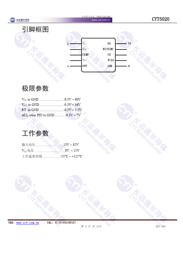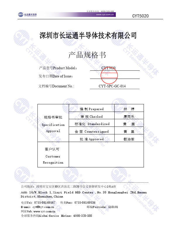 CYT5020 深圳市长运通半导体技术有限公司 产品规格书 产品型号Product Model: 发布日期Date of Issue: 文档编号Document No.: -0.3V ~ 90V VCC to GND............................ -0.3V ~ 16V RT to GND ............................