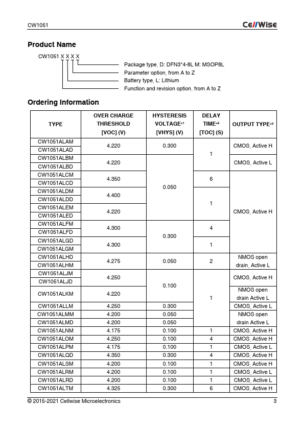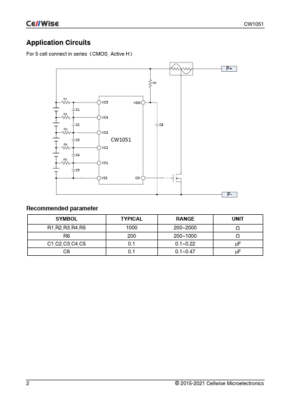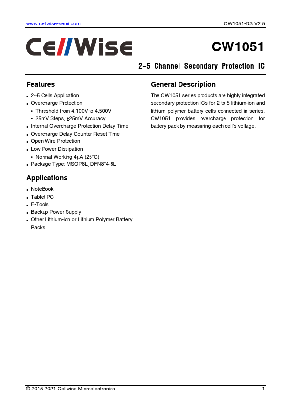 The CW1051 series products are highly integrated secondary protection ICs for 2 to 5 lithium-ion and lithium polymer battery cells connected in series. CW1051 provides overcharge protection for battery pack by measuring each cell’s voltage. MSOP8L Parameter option, from A to Z Battery type,.
