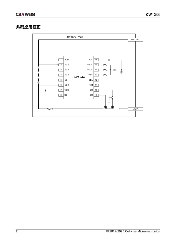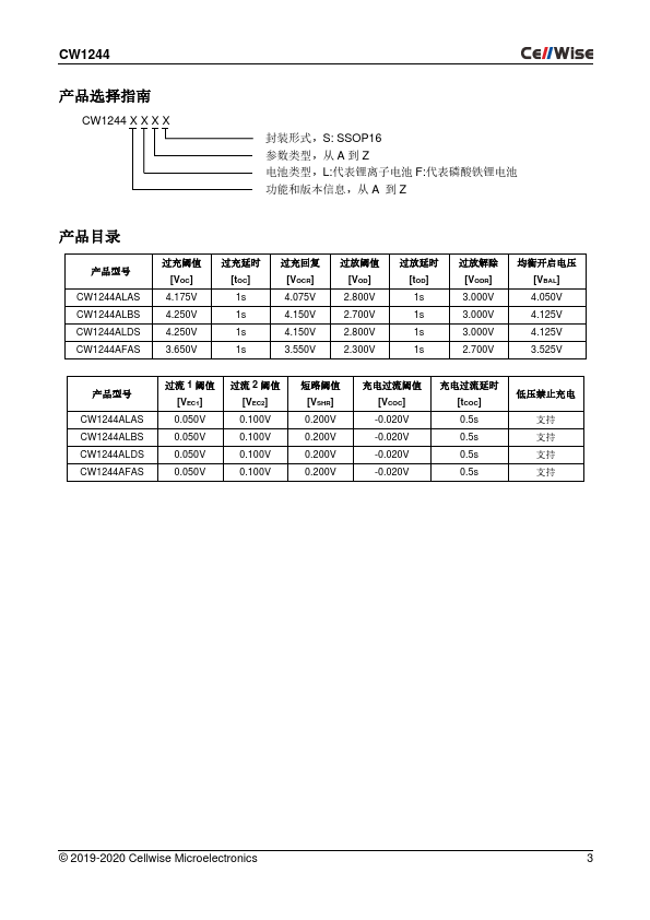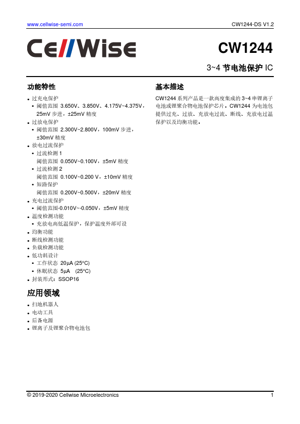 .cellwise-semi. CW1244-DS V1.2 CW1244 3~4 节电池保护 IC 功能特性 基本描述 过充电保护 阈值范围 3.650V、3.850V、4.175V~4.375V, 25mV 步进,± 25mV 精度 过放电保护 阈值范围 2.300V~2.800V,100mV 步进, ± 30mV 精度 放电过流保护 过流检测 1 阈值范围 0.050V~0.100V,± 5mV 精度 过流检测 2 阈值范围 0.100V~0.200 V,± 10mV 精度 短路保护 阈值范围.
