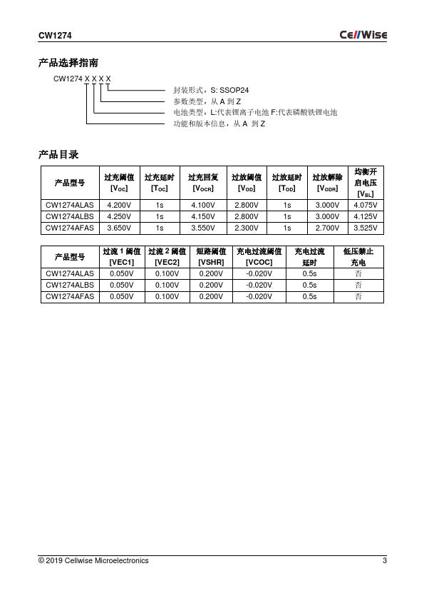 .cellwise-semi. CW1274-DS V1.0 CW1274 4~7 节电池保护 IC 功能特性 基本描述 过充电保护 阈值范围 3.650V、3.850V、4.175V~4.350V, 25mV 步进,± 25mV 精度 过放电保护 阈值范围 2.300V~2.800V,100mV 步进, ± 30mV 精度 过电流保护 过流检测 1 阈值范围 0.050V~0.100V,± 5mV 精度 过流检测 2 阈值范围 0.100V~0.200 V,,± 10mV 精度 短路保护 阈值范围.