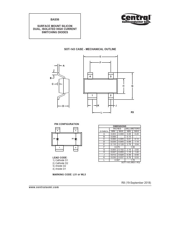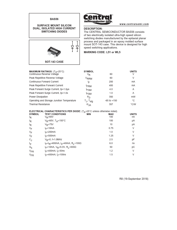 The CENTRAL SEMICONDUCTOR BAS56 consists of two electrically isolated ultra-high speed silicon switching diodes manufactured by the epitaxial planar process and packaged in an epoxy molded surface mount SOT-143 case. This device is designed for high speed switching applications. L51 or WL5 SOT-143 CASE MAXIMUM RATINGS:.