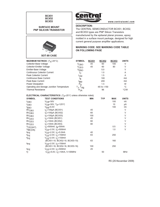 : The CENTRAL SEMICONDUCTOR BCX51, BCX52, and BCX53 types are PNP Silicon Transistors manufactured by the epitaxial planar process, epoxy molded in a surface mount package, designed for high current general purpose amplifier applications.