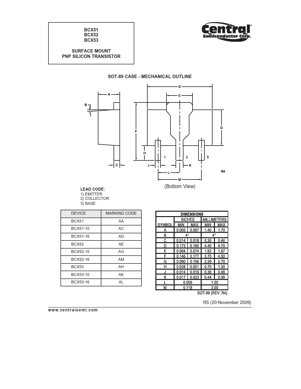 Overview: BCX51 BCX52 BCX53 SURFACE MOUNT PNP SILICON TRANSISTOR w w w. c e n t r a l s e m i .